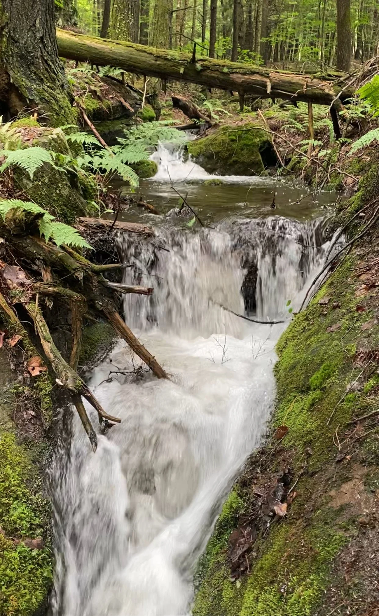 At the heart of the land are three large ponds, each flowing one into the other south to north. The ponds are fed by mountain streams which originate on the property. Each pond supports an abundance of aquatic life including perch, trout, turtles and salamanders. They are completely private and ideal for swimming, fishing, and paddling. On the south pond, there is a rope swing—rigged high up between two hemlock trees—offering an exhilarating ride out over the water before letting go and plunging into the pond below. You can then swim out to the raft beyond or back to shore. At the far end of the northernmost pond, a natural spillway leads to a graceful waterfall.