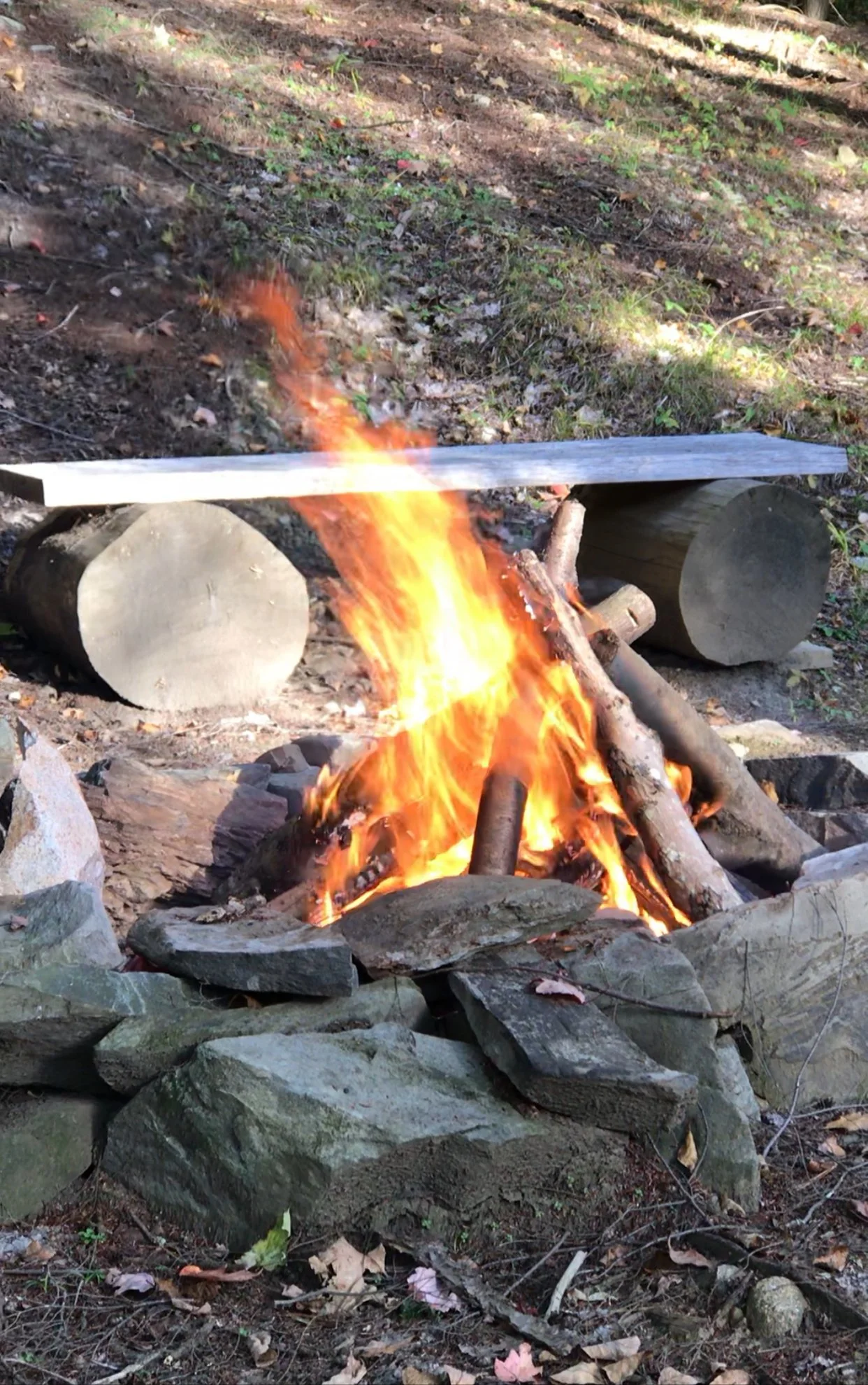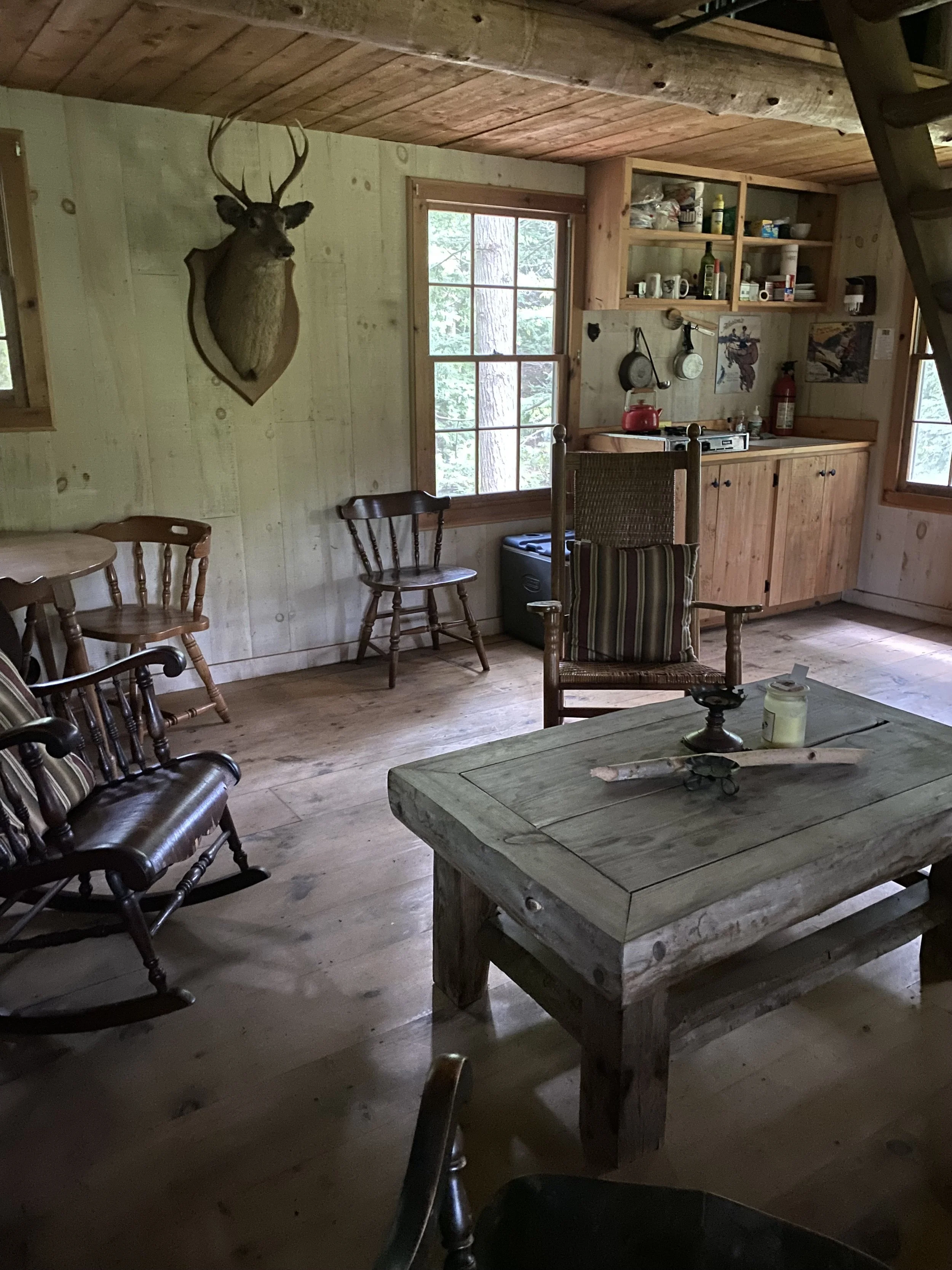 Beside the south pond is a full-scribe Swedish cope log cabin, built by renowned craftsman John Nininger of The Wooden House Company. The front porch overlooks the water, while next to it, a stone platform provides the launch point for the rope swing. Inside, rustic comforts blend authenticity and charm: a cylinder wood-fired cookstove with side-mounted water tank and oven, a bunk bed built from reclaimed boards and logs, and a twin bed. The inward-opening windows are secured with wooden kerfs, and the rough-sawn hemlock floors anchor the space with rugged simplicity. Some of the pine logs measure 16 inches in diameter—one weighing over 1,200 pounds—demonstrating the skill and strength required to craft such a rugged structure. Both the floor and ceiling are insulated, ensuring warmth in winter and comfort in summer.