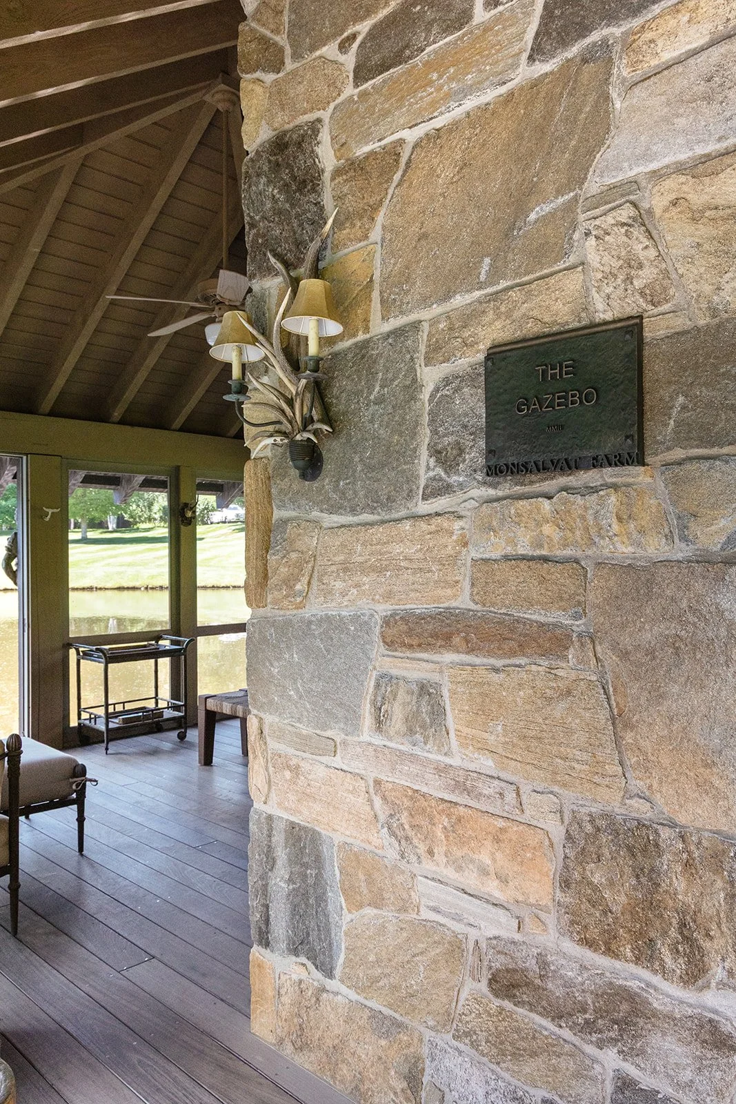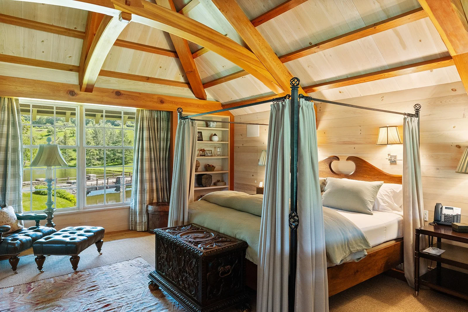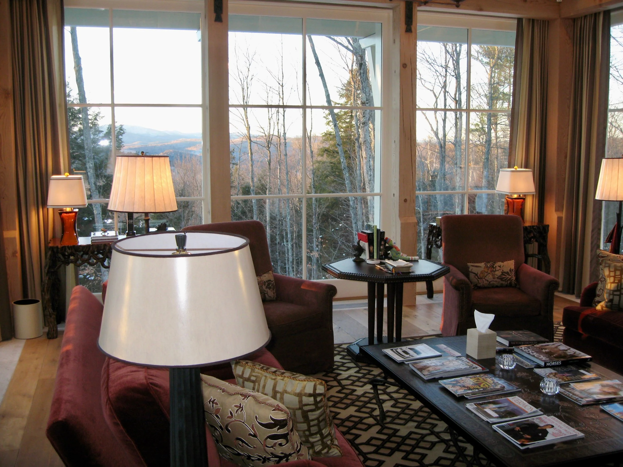 Expansive windows frame sweeping views of the hills and meadows, while French doors and built-in bookcases add refinement and function. The vaulted ceiling and staircase showcase artisan detailing, while a screened porch extends the living space outside and into the landscape.
