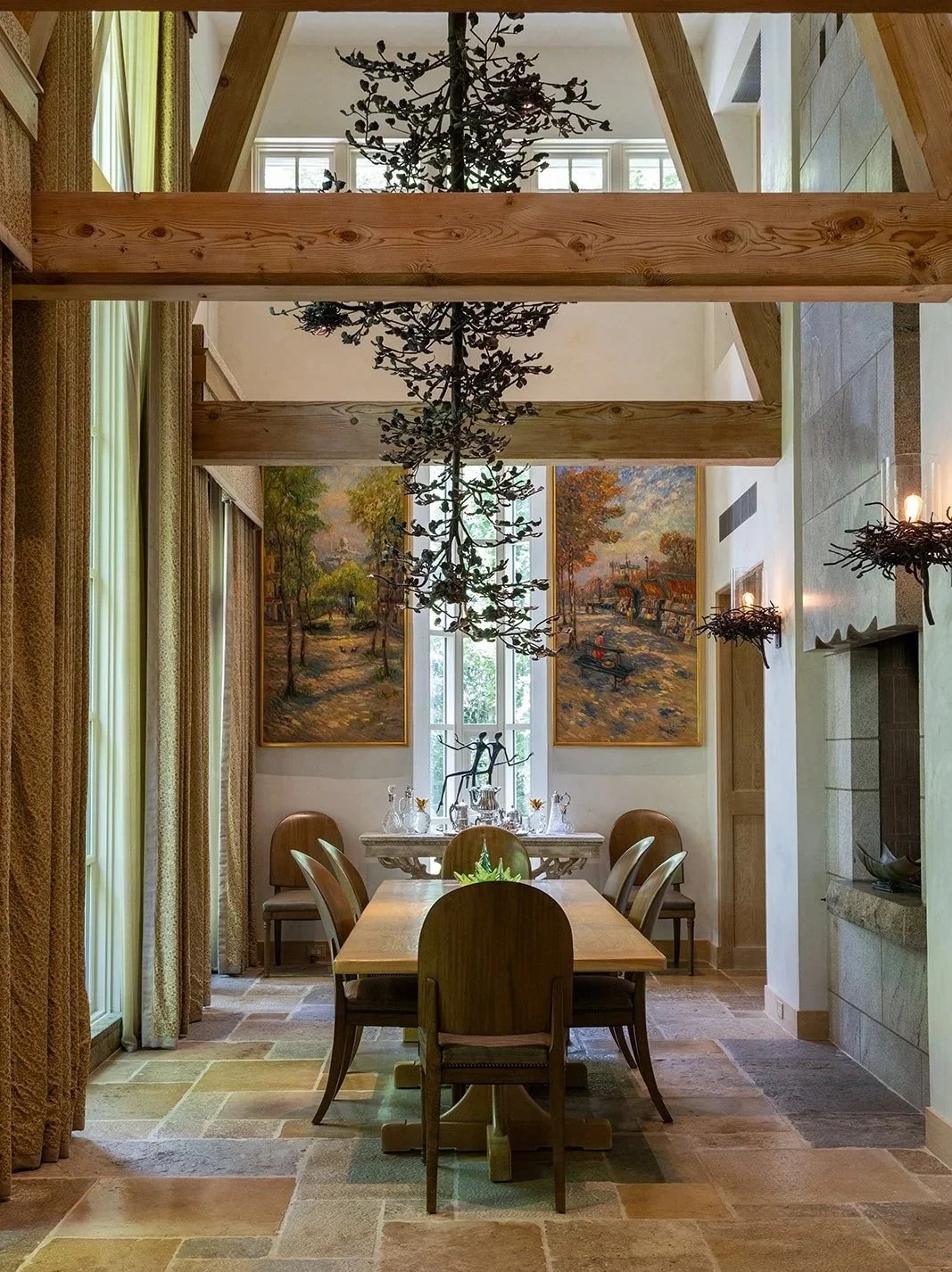 The bathrooms are designed with timeless simplicity, combining natural wood paneling and marble finishes with classic fixtures that echo the home’s refined craftsmanship. A powder room next to the front entry with a stenciled tree on its wooden walls, adds convenience for guests, ensuring every space blends elegance with ease of living.